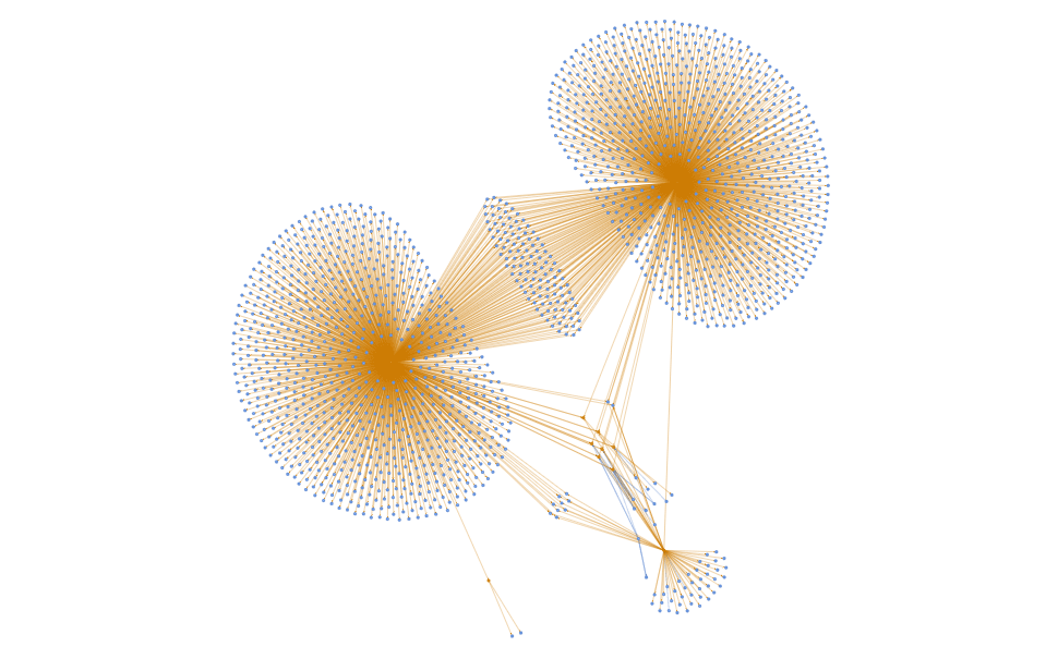Now we can process the edges to obtain the nodes for the graph. At the same time, we colour the nodes orange if they are part of the queried nodes, otherwise we leave them as blue.