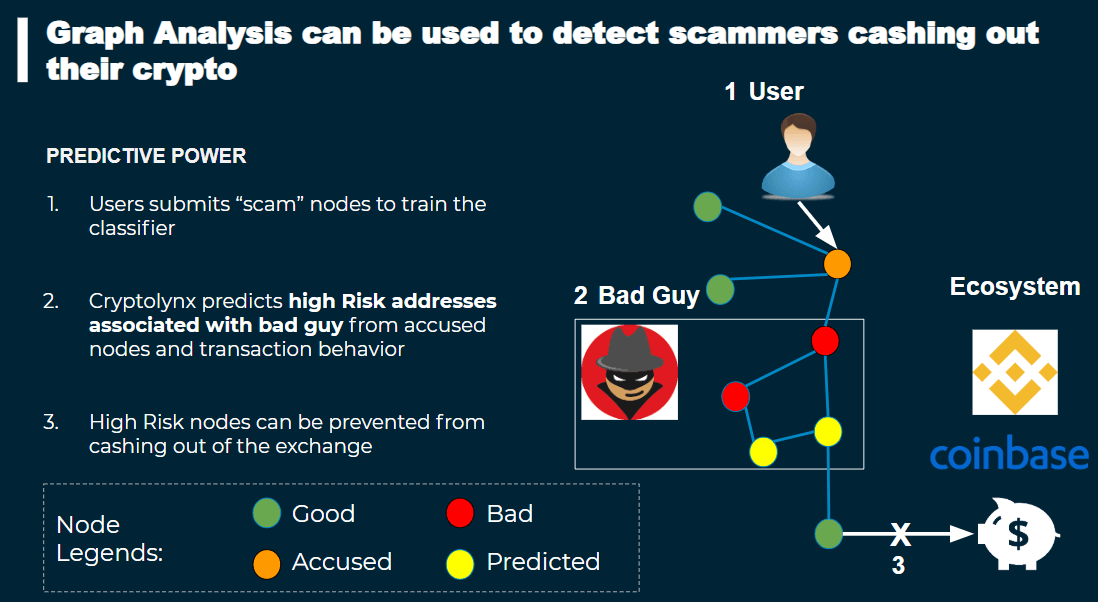 Basically, we proposed building a wall around the exchanges to prevent fraudulent users from cashing out their cryptocurrencies to fiat money. We realised that there are three main features which makes fraud detection in the cryptocurrency space unique: