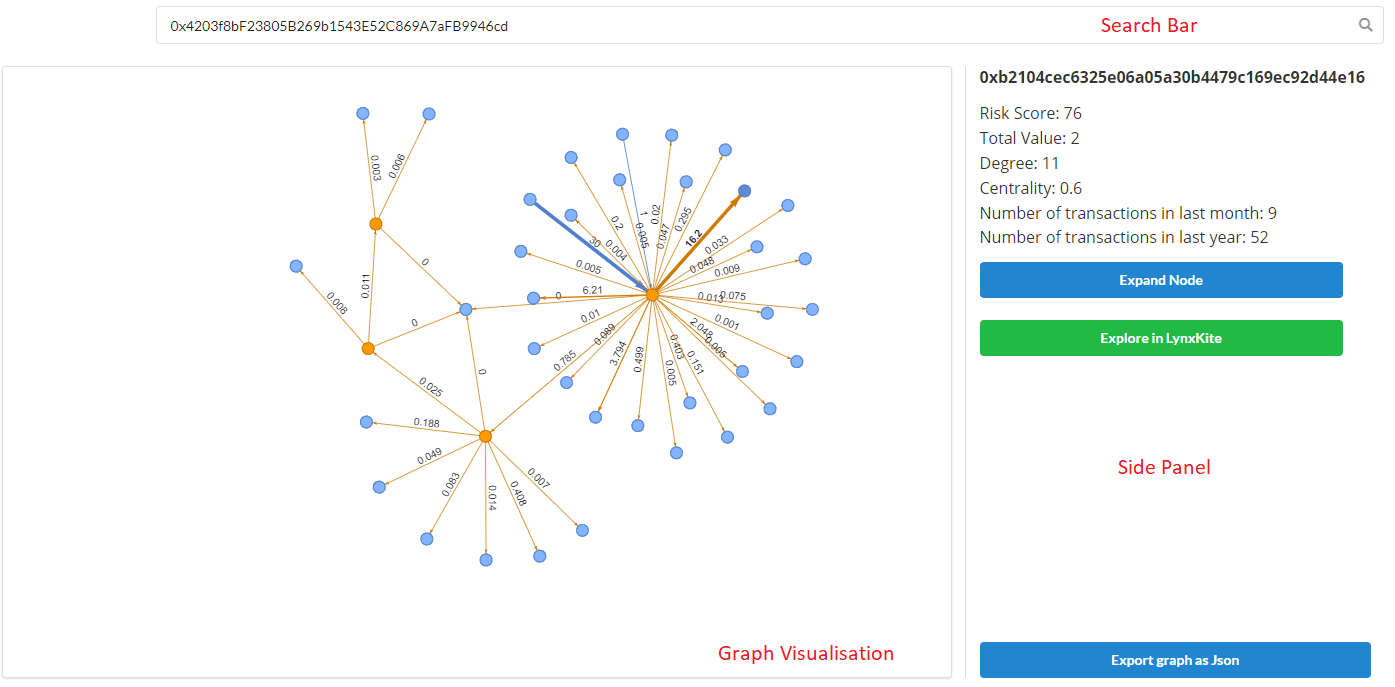 As part of the solution we showcased a graph explorer that would enable an analyst to trace the trail of potential scam nodes / money laundering activities. You can check out a demo of the app at: https://cryptolynx.netlify.com/console/.